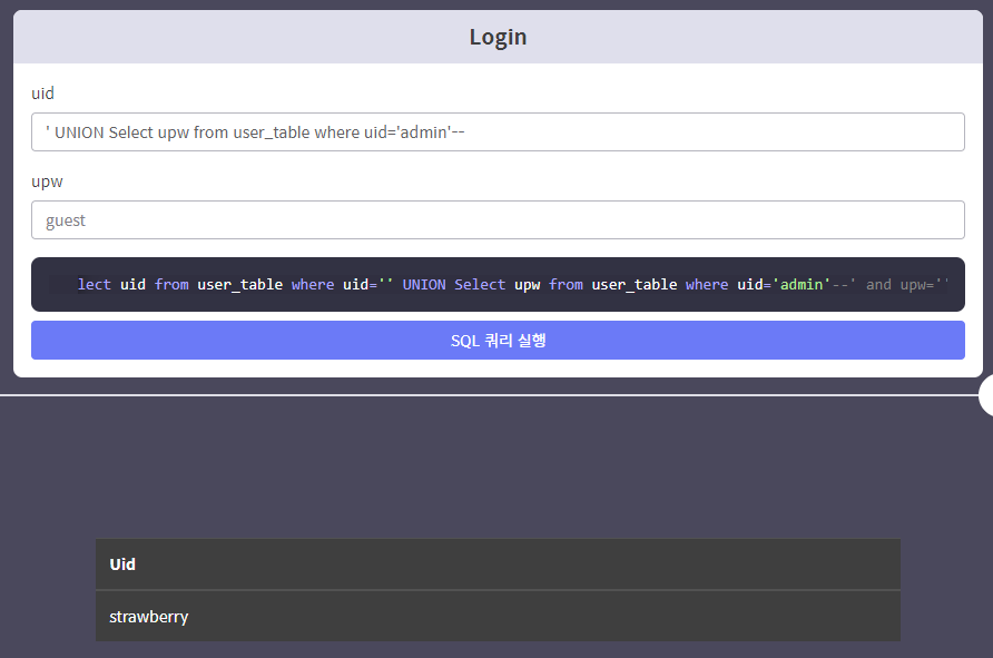 SELECT uid FROM user_table WHERE uid='' UNION SELECT upw FROM user_table WHERE uid='admin' -- and...