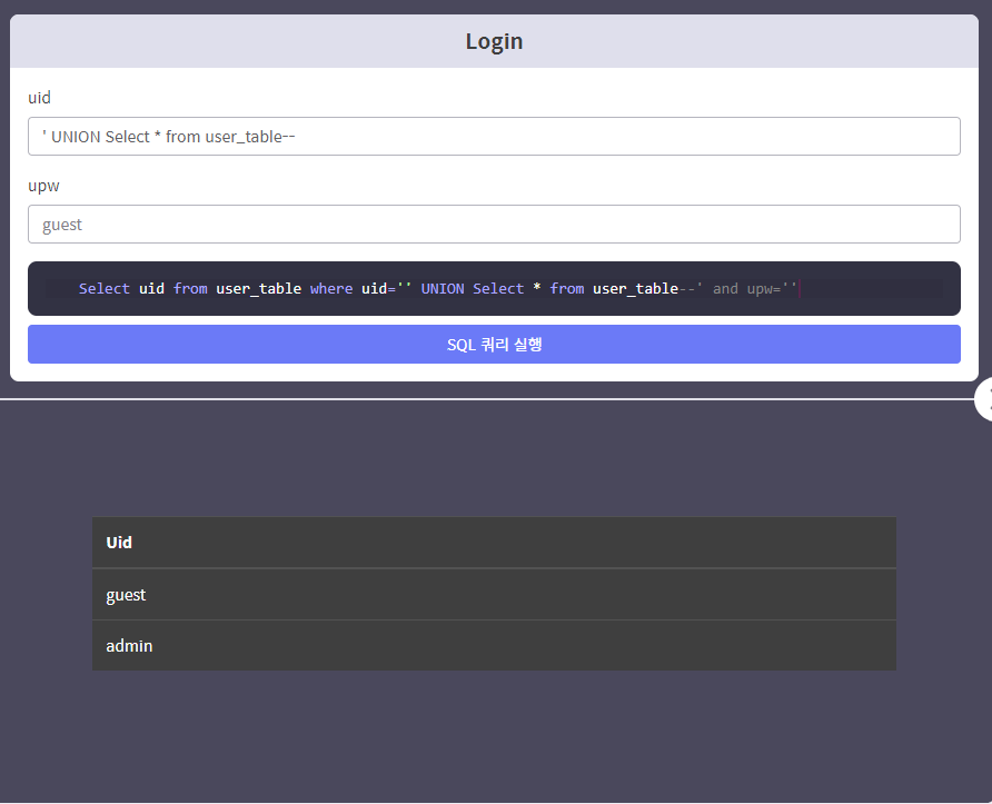 - 예제1 에서 출력되는 컬럼은 uid 하나 뿐이지만, upw 라는 컬럼이 테이블에 있다는 것을 알고 있다면,