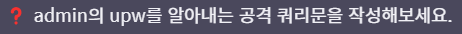 예제2) admin의 upw를 알아내는 공격 쿼리문
