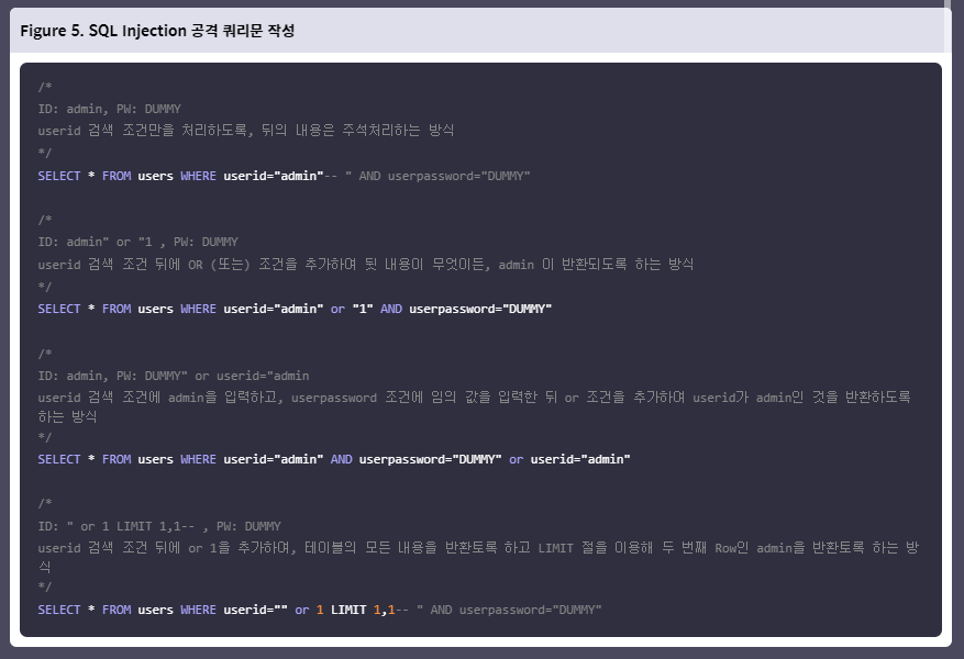 - 취약점: 이용자의 입력값이 포함된 쿼리를 동적으로 생성하고 사용하면서 발생